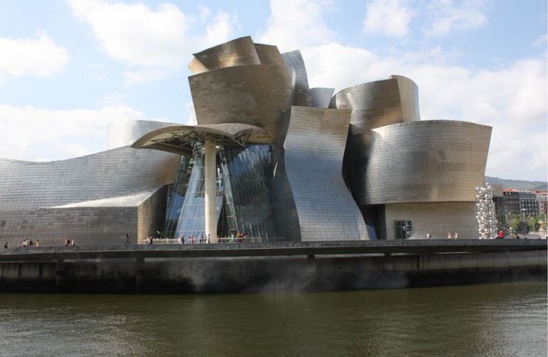 Музей Гуггенхайма в испанском городе Бильбао — инновационное современное архитектурное чудо. Музей был официально открыт в октябре 1997. Его проект разработан известным американо-канадским архитектором Френком Гери и представляет из себя ряд связанных зданий с титановыми и стеклянными элементами. Все кривые линии музея Гуггенхайма сделаны из титана, как самая впечатляющая черта дизайна музея. Эти кривые отражают свет и придают зданию особый вид с любой точки зрения. 11000 из 24000 квадратных метров площади музея посвящены выставочному пространству с 19 галереями.