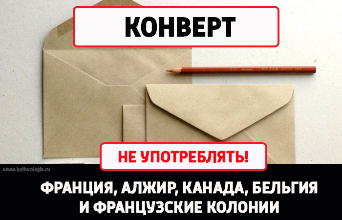 Для франкоязычных стран «конверт» в русском варианте произношения — нецензурное словосочетание, которое переводится как «зеленая вaгинa» (con vert).