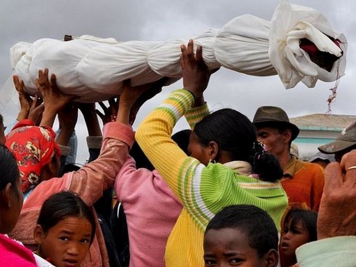 Жители острова Мадагаскар раз в семь лет совершают уникальный ритуал, “танцы с мертвыми”. Во время этого обряда, сопровождаемого живой музыкой, они вскрывают склепы с останками своих родственников, достают их оттуда и заворачивают покойников в новую чистую ткань.