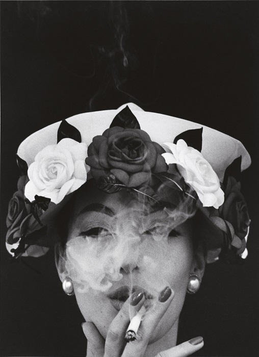 Женщина в шляпе с 5-ю розами, Paris Vogue, 1956 год. Американский фотограф и кинорежиссёр Уильям Кляйн.
