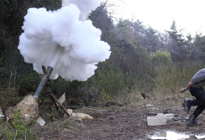 Боевики Свободной Сирийской армии, стреляющие из миномётов. Северо-запад Сирии, провинция Латакия, район Джебель-аль-Akrad. 25 февраля 2014 года.