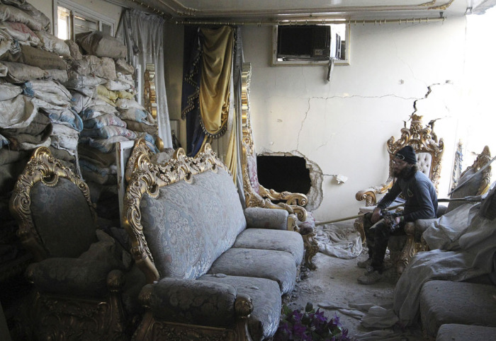 Боевики Свободной Сирийской армии внутри комнаты для отдыха в разрушенном здании. Старый город Алеппо, 19 февраля 2014 года.