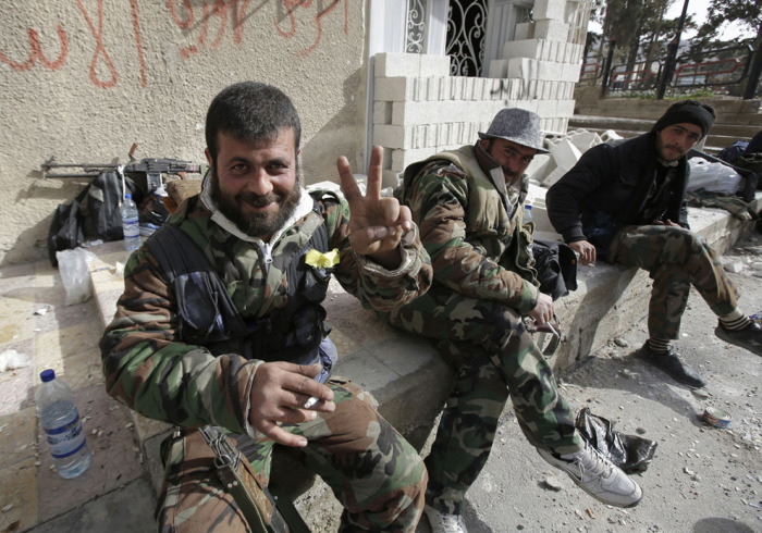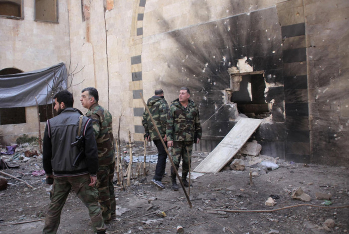 Войска, верные президенту Сирии Башару аль-Асаду возле проломленной от взрыва стены. Старый городе Алеппо, 11 февраля 2014 года.