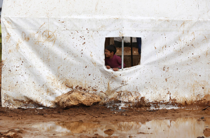 Сирийский мальчик выглядывает из палатки находящейся на территории лагеря Баб Аль-Салам беженцев в Азаза, недалеко от Турецкой границы. 14 марта 2014 года.