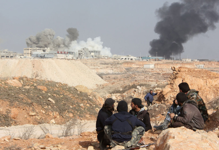 Боевики Свободной Сирийской армии на фоне горящий коммуникаций на окраине сирийского города Алеппо.