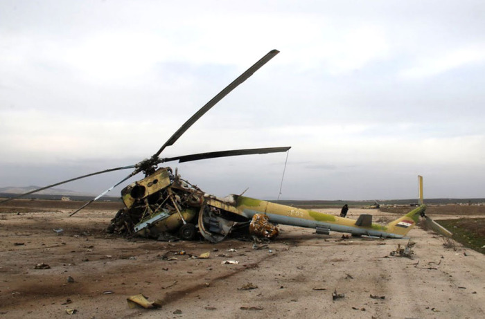 Обломки сбитого вертолёта сирийской армии на взлётно-посадочной полосе в окраине города Алеппо.