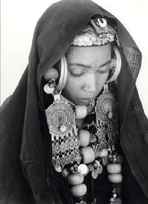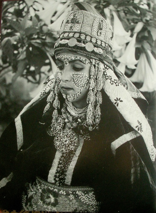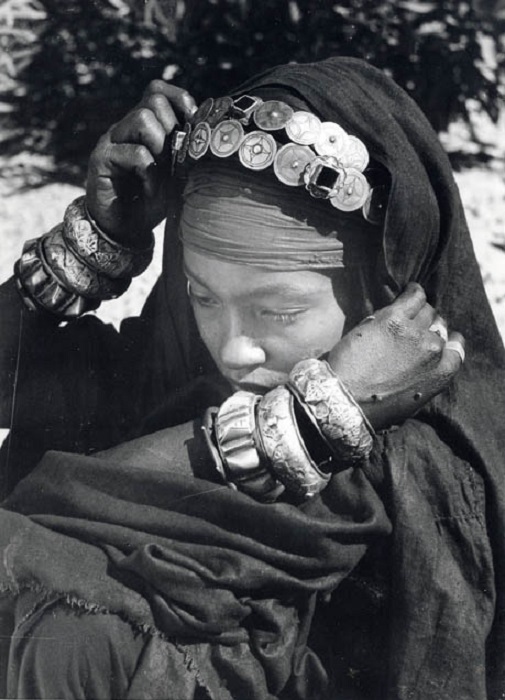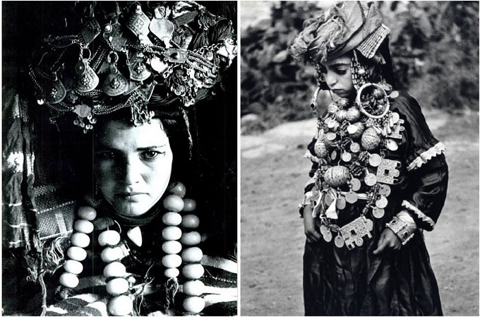 Бросается в глаза обилие серебряных украшений, весом до нескольких килограммов, которые покрывают всю фигуру женщины от макушки до пят.