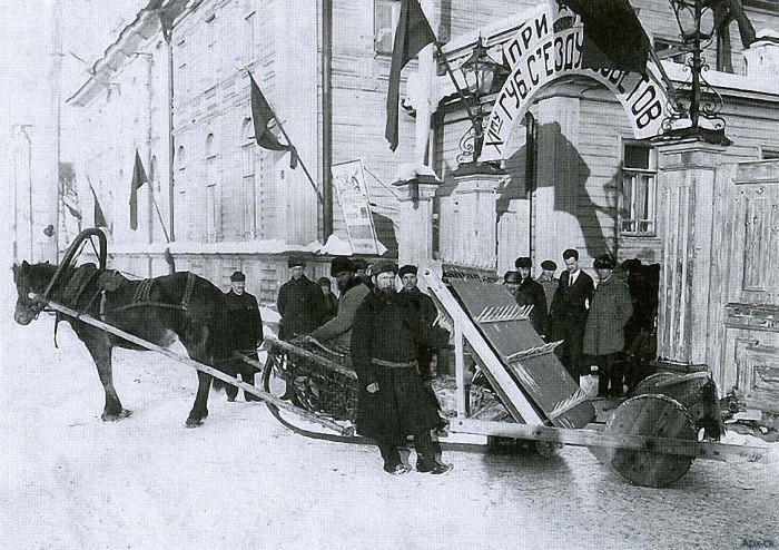 Крестьянин демонстрирует депутатам губернского съезда Советов свое изобретение-элеватор для уборки сена, март 1926 года.