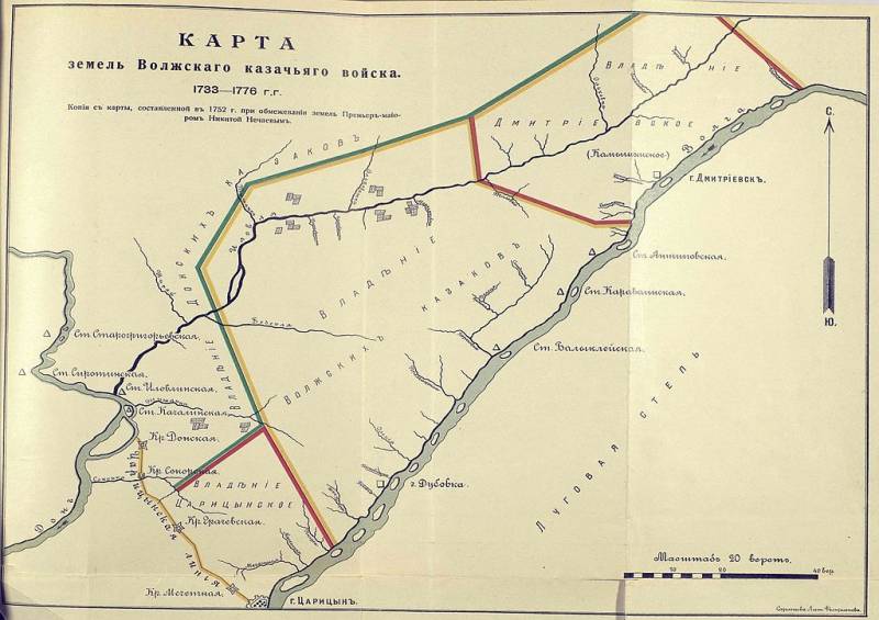 13 июня 1723 г. было образовано Волгское войско казачье. Оно было образовано в связи с созданием Царицынской пограничной укрепленной линии, с центром в Дубовке, на правом берегу Волги, севернее Царицына (ныне Волгограда). Создавалось оно в основном из переселенных на Волгу донских (520 семей) и днепровских черкасов (537 семей). Черкасами называли в то время малороссийских казаков, прибывших в Россию и проживавших на территории Войска Донского и на Слабожанщине.