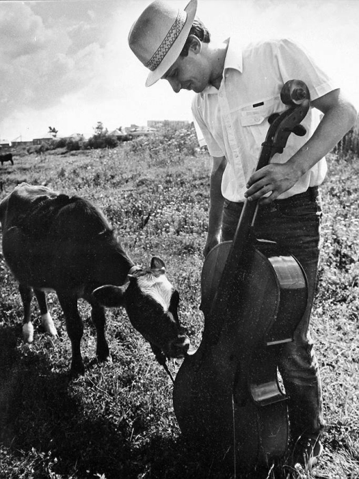 Коза тыкает носом в музыкальный инструмент, как будто хочет еще послушать музыку.