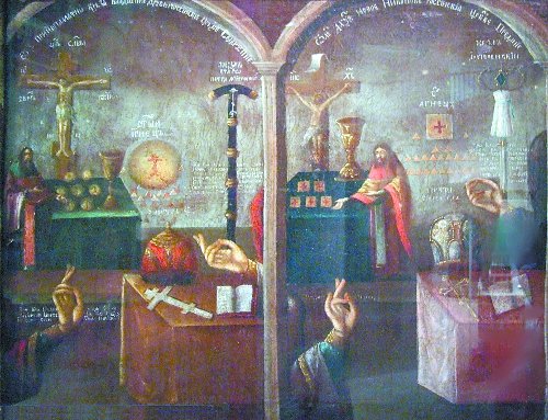 И конечно, грянуло массовое исправление церковных книг. Собственно, книги правились и при предшественниках Никона, но сплошной характер это явление приобрело именно с никонианской реформацией. Были ли устранены их недостатки? Естественно, нет: одни расхождения закреплялись, другие редактировались по ранее неверно исправленным рукописям, третьи возникали вследствие невнимательности справщиков. Часто одни и те же тома, переписанные в разное время, отличались друг от друга. Тогда же началось постепенное вытеснение классической русской иконы «религиозными картинками», «итальянщиной».