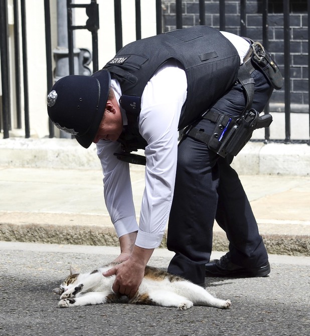 Премьер-министр Дэвид Кэмерон бросил серебряную вилку в мышь, которая забрела на встречу с участием главы правительства. Ларри подвергся резкой критике за неспособности ловить грызунов. Он предпочитает спать, а не выполнять свои обязанности.