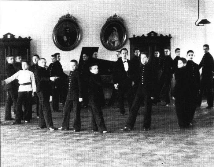Юные воспитанники 1-го Кадетского корпуса на занятиях бальными танцами. Россия, 1910-е годы.