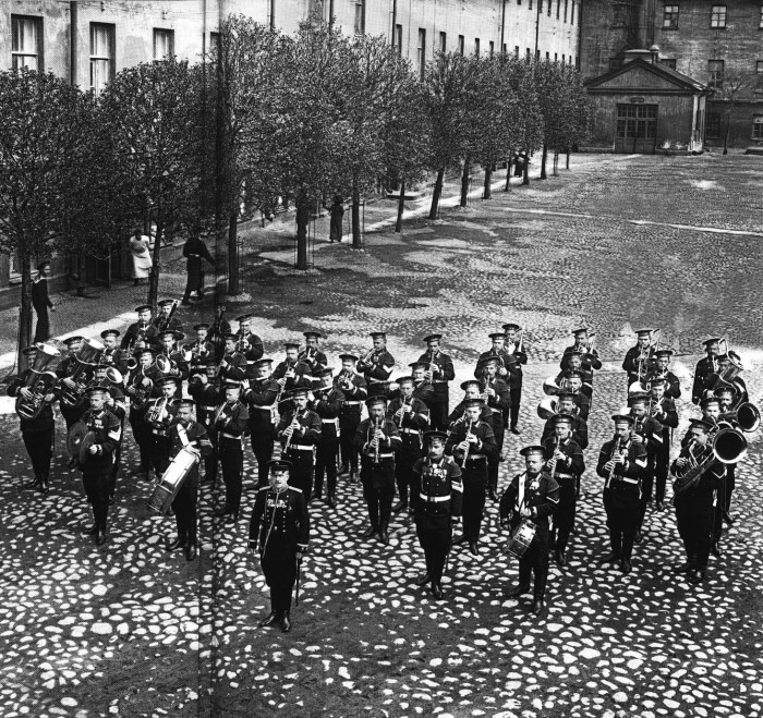 Оркестр Морского Гвардейского экипажа на плацу перед выходом на парад. Россия, 1912 год.
