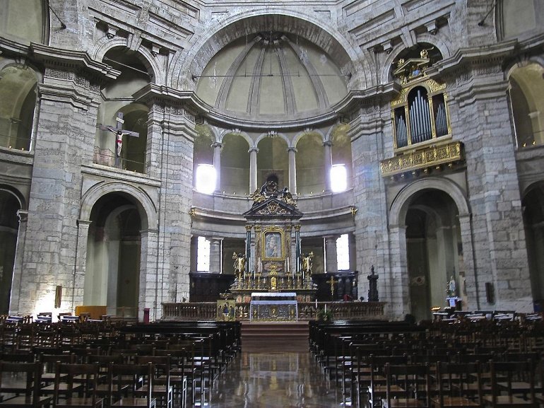 Восьмиугольная планировка с центральным куполом и большой крытой галереей, окруженной четырьмя башнями — типичный для ранних христианских церквей план. Огромный купол опирается на восьмиугольный барабан, восстановленный в конце шестнадцатого века Мартино Масси. Портик перед церковью был добавлен намного позже, в конце девятнадцатого века.