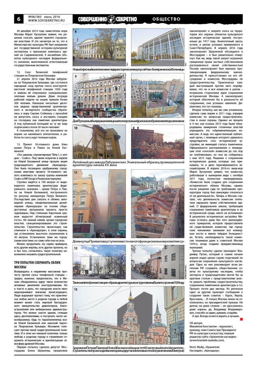 21 апреля 2016 года Москва забурлила на Покровском бульваре, где состоялся народный сход против сноса конструктивистской телефонной станции 1929 года и замены её откровенно «нуворишским» элитным жилым домом. Даже посреди рабочей недели на акцию пришли более 300 человек. Накануне несколько десятков видных представителей архитектурного и экспертного сообщества обратились к мэру Сергею Собянину с просьбой не допустить сноса и поставить станцию на госохрану как памятник архитектуры. А под публичной петицией на ту же тему подписались почти 30 тысяч человек!
