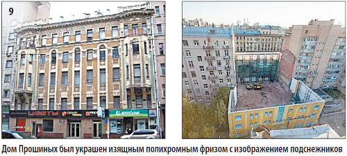 Дом Прошиных, перестроенный в 1905 году по проекту архитектора Павла Заруцкого из более раннего здания, по единодушному мнению специалистов, представлял собою особо ценный образец архитектуры московского модерна. Его главный фасад был украшен изящным полихромным фризом с изображением подснежников. Фриз, выполненный в технике сграффито, характерной для лучших построек европейского арнуво начала ХХ века, не имел аналогов в архитектуре Москвы.