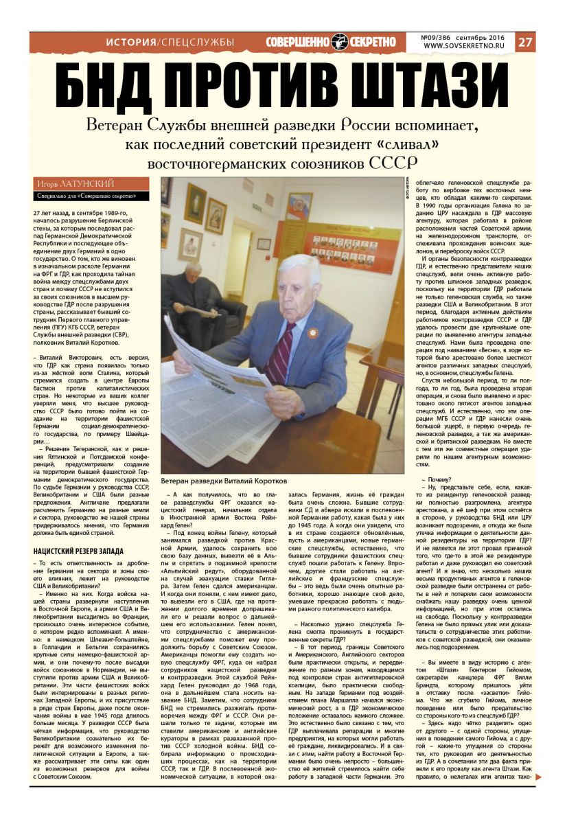 27 лет назад, в сентябре 1989-го, началось разрушение Берлинской стены, за которым последовал распад Германской Демократической Республики и последующее объединение двух Германий в одно государство. О том, кто же виновен в изначальном расколе Германии на ФРГ и ГДР, как проходила тайная война между спецслужбами двух стран и почему СССР не вступился за своих союзников в высшем руководстве ГДР после разрушения страны, рассказывает бывший сотрудник Первого главного управления (ПГУ) КГБ СССР, ветеран Службы внешней разведки (СВР), полковник Виталий Коротков.