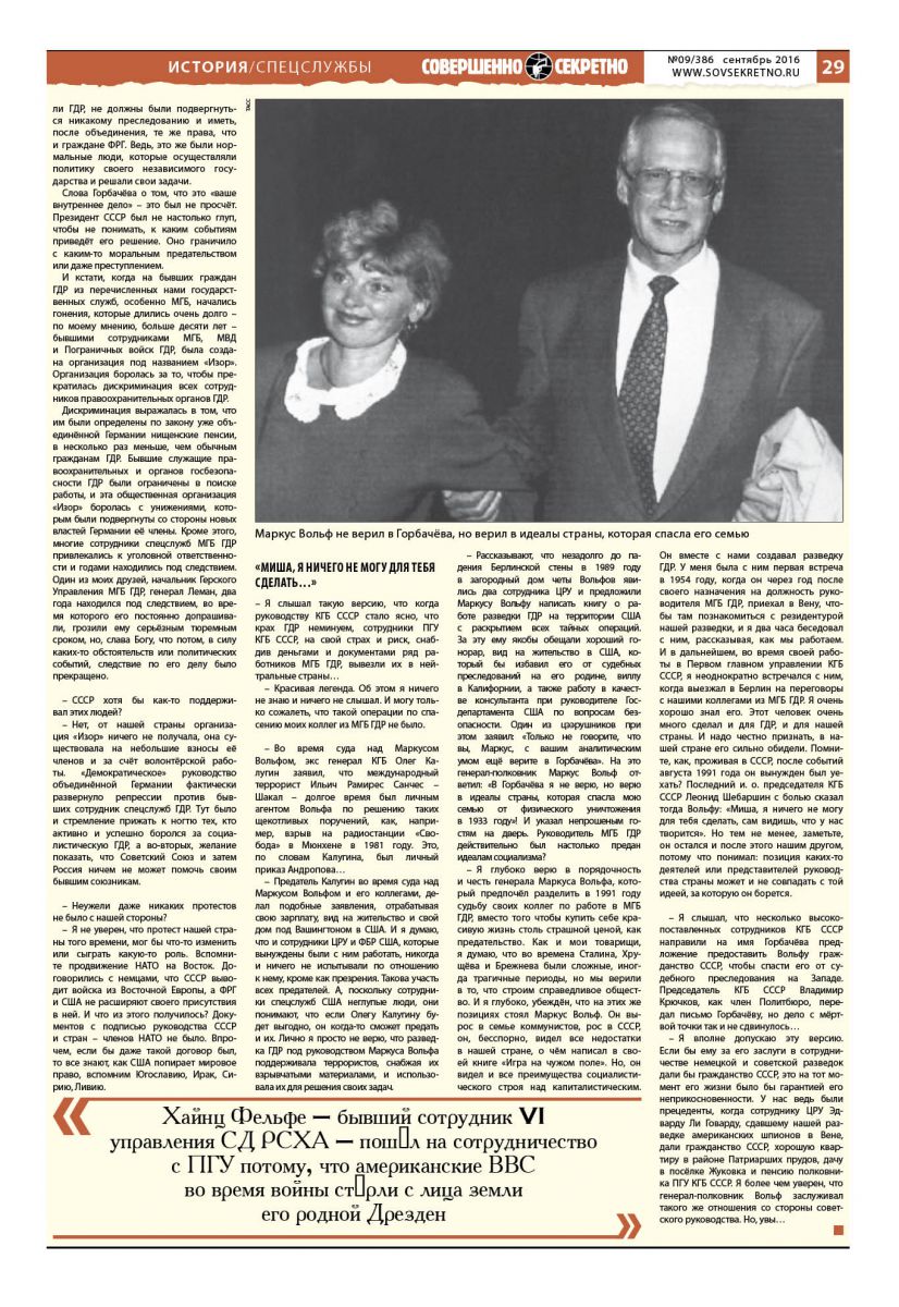 – Я слышал, что несколько высокопоставленных сотрудников КГБ СССР направили на имя Горбачёва предложение предоставить Вольфу гражданство СССР, чтобы спасти его от судебного преследования на Западе. Председатель КГБ СССР Владимир Крючков, как член Политбюро, передал письмо Горбачёву, но дело с мёртвой точки так и не сдвинулось…