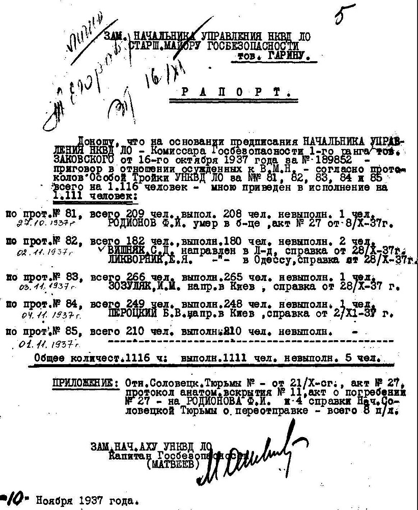 10 ноября 1937 года капитан госбезопасности Матвеев отрапортовал: «Доношу, что на основании предписания НАЧАЛЬНИКА УПРАВЛЕНИЯ НКВД – Комиссара Госбезопасности 1-го ранга тов. ЗАКОВСКОГО от 16-го октября 1937 года за № 189852 – приговор в отношении осужденных к В.М.Н. – согласно протоколов Особой Тройки УНКВД ЛО за № № 81, 82, 83, 84 и 85 всего на 1.116 человек – мною приведен в исполнение на 1.111 человек: