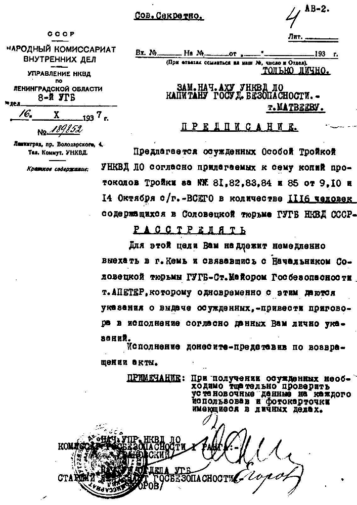 Той же датой, 16 октября 1937 года, датировано и выданное капитану госбезопасности Михаилу Матвееву предписание: «Предлагается осужденных Особой Тройкой УНКВД ЛО… ВСЕГО в количестве 1116 человек, содержащихся в Соловецкой тюрьме ГУГБ НКВД СССР, – РАССТРЕЛЯТЬ». Посему «для этой цели Вам надлежит немедленно выехать в г. Кемь и связавшись с Начальником Соловецкой тюрьмы ГУГБ – Ст. Майором Госбезопасности т. АПЕТЕР, которому одновременно с этим даются указания о выдаче осужденных, – привести приговора в исполнение согласно данных Вам лично указаний».