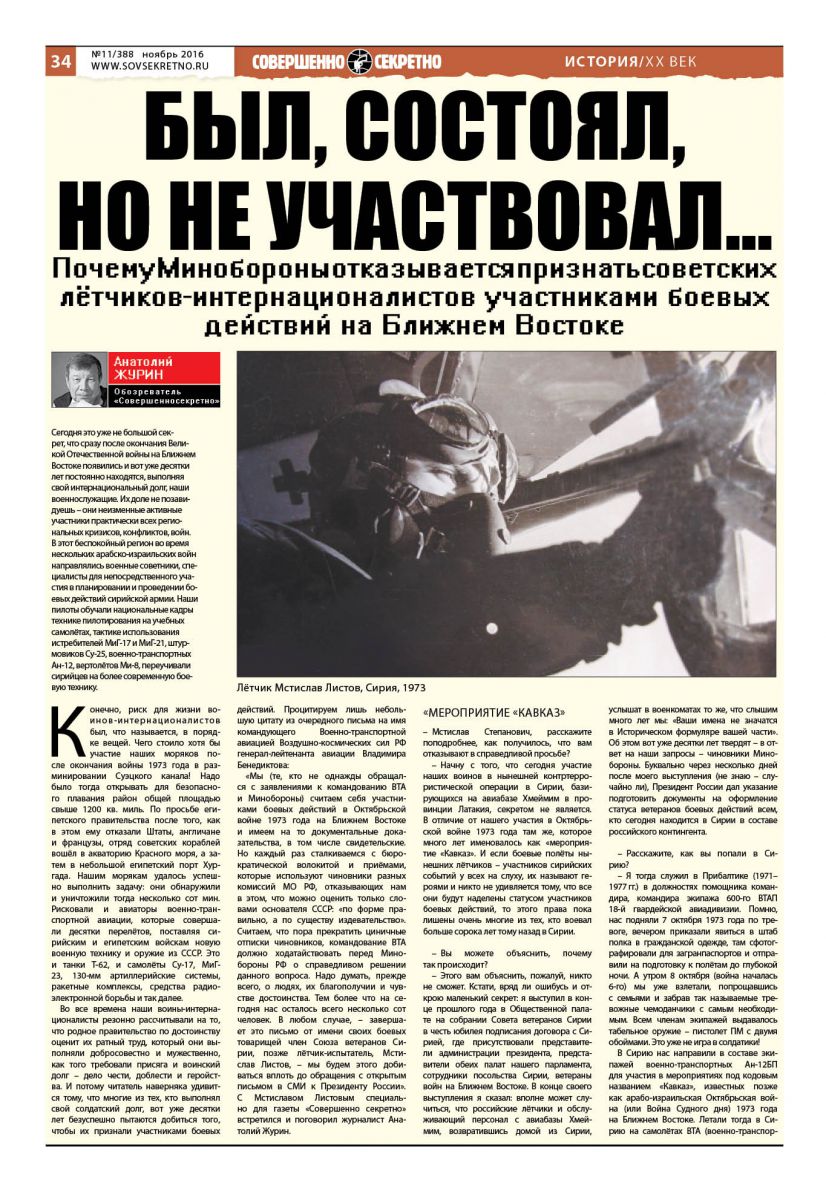 «Мы (те, кто не однажды обращался с заявлениями к командованию ВТА и Минобороны) считаем себя участниками боевых действий в Октябрьской войне 1973 года на Ближнем Востоке и имеем на то документальные доказательства, в том числе свидетельские. Но каждый раз сталкиваемся с бюрократической волокитой и приёмами, которые используют чиновники разных комиссий МО РФ, отказывающих нам в этом, что можно оценить только словами основателя СССР: «по форме правильно, а по существу издевательство». Считаем, что пора прекратить циничные отписки чиновников, командование ВТА должно ходатайствовать перед Минобороны РФ о справедливом решении данного вопроса. Надо думать, прежде всего, о людях, их благополучии и чувстве достоинства. Тем более что на сегодня нас осталось всего несколько сот человек. В любом случае, – завершает это письмо от имени своих боевых товарищей член Союза ветеранов Сирии, позже лётчик-испытатель, Мстислав Листов, – мы будем этого добиваться вплоть до обращения с открытым письмом в СМИ к Президенту России». С Мстиславом Листовым специально для газеты «Совершенно секретно» встретился и поговорил журналист Анатолий Журин.
