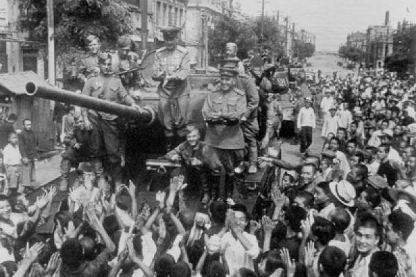 Население китайского города Далянь радостно встречает танкистов советского 7-го механизированного корпуса 6-й гвардейской танковой армии, 28 августа 1945 г.