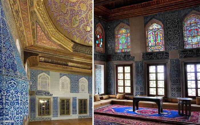 Помещения богато украшены, поражают затейливые узоры и разнообразие видов декора (роспись, резьба, инкрустация). Изразцы (использована изникская керамика) удивляют выдумкой и разнообразием.