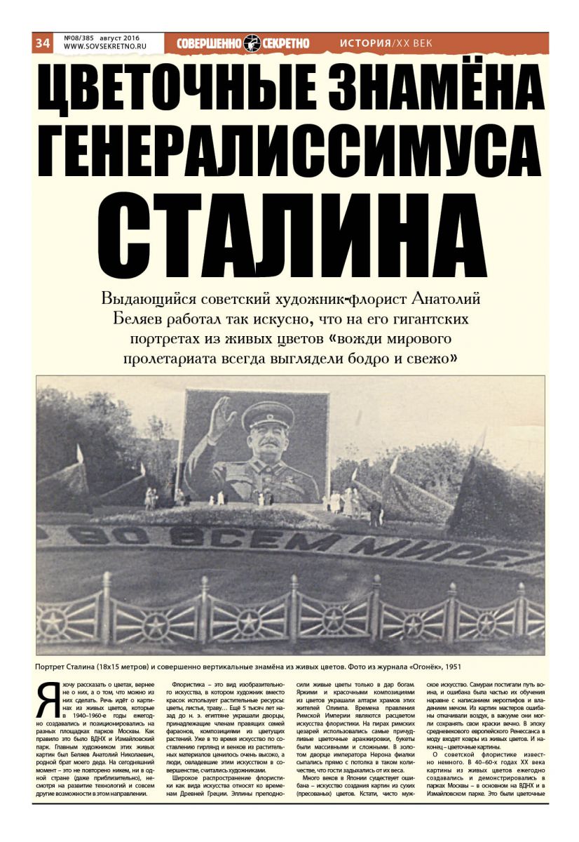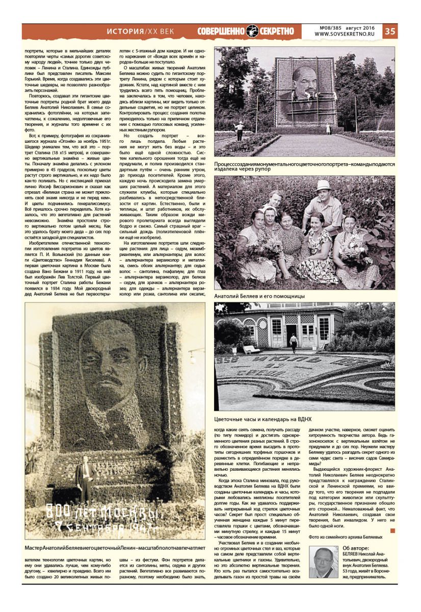 Изобретателем отечественной технологии изготовления портретов из цветов является П. И. Волынский (по данным книги «Цветоводство» Геннадия Киселева). А первая цветочная картина в Москве была создана Вано Бежани в 1911 году, на ней был изображён Лев Толстой. Первый цветочный портрет Сталина работы Бежани появился в 1934 году. Мой двоюродный дед Анатолий Беляев не был первооткрывателем технологии цветочных картин, но ему они удавались лучше, чем кому-либо другому, – ювелирно и правдиво. Всего им было создано 20 великолепных живых полотен с 5-этажный дом каждое. И ни одного нарекания от «Вождя всех времён и народов» больше не поступало.