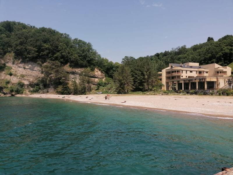 Находится она в уютной бухте и имеет свой собственный пляж изолированной от нескромных взглядов. Интересно, что для Абхазии характерны песчано-галечные пляжи за редким исключением в той же Пицунде у Белых скал. Но на даче Горбачева пляж именно песчаный и, по историческим сведениям, песок для него завозили аж из Болгарии, с курорта «Золотые пески». Ближе хорошего песка, конечно, не нашлось…