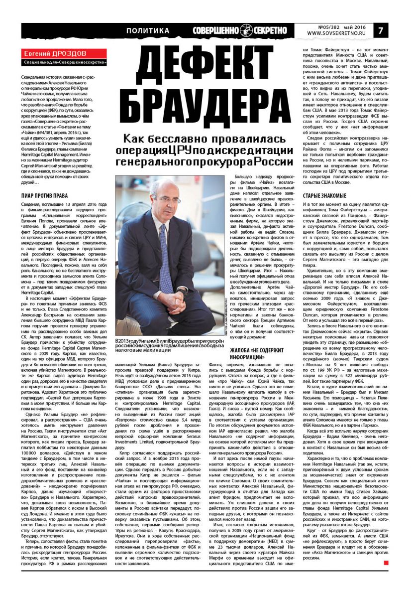 Скандальная история, связанная с «расследованием» Алексея Навального о генеральном прокуроре РФ Юрии Чайке и его семье, получила весьма любопытное продолжение. Мало того, что разоблачения Фонда по борьбе с коррупцией (ФБК), по сути, оказались ярко упакованным вымыслом, о чём газета «Совершенно секретно» рассказывала в статье «Фантазии на тему «Чайки» (№4/381, апрель 2016 г.), так ещё и удалось увидеть «уши» заказчика всей этой эпопеи – Уильяма (Билла) Феликса Браудера, главы компании Hermitage Capital Management. Именно за махинации Hermitage аудитор Сергей Магнитский угодил за решётку, где и скончался, так и не дождавшись обещанной «руки помощи» от своих друзей…