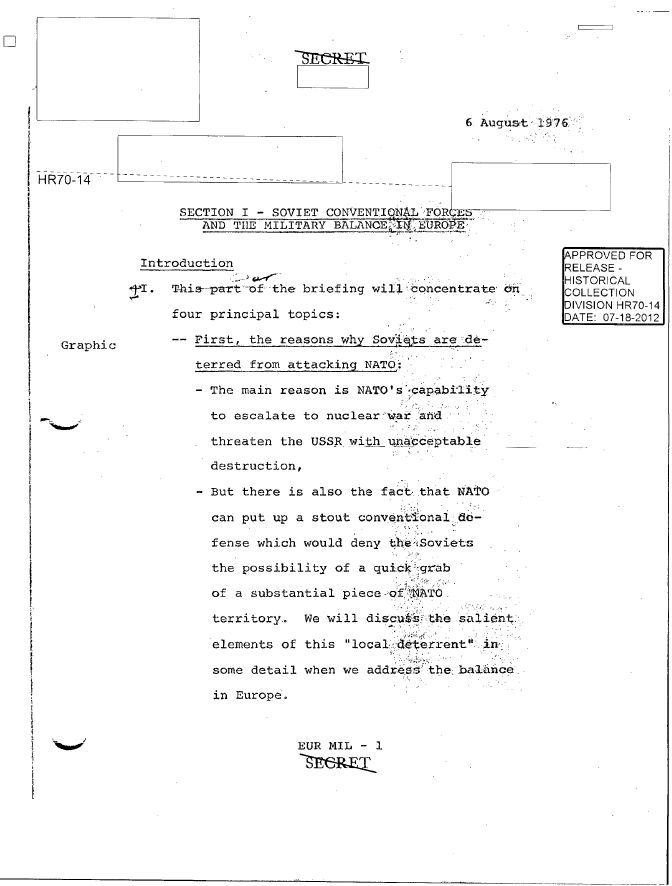 1. Сегодня я проинформирую вас о балансе вооруженных сил между Организацией Варшавского договора и НАТО. Как таковой, наш доклад будет, конечно, акцентирован на вооруженные силы в Западной Европе. Поскольку Советский Союз является такой большой страной, и имеет, по крайней мере, один потенциальный противника вне Европы, мы полностью рассмотрим ее неядерные силы.