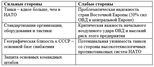 – Меньшая защищенность командных центров НАТО, по сравнению с командными центрами ОВД. (Как и в случае с другими изученными нами факторами, здесь имеет место заметная асимметрия в подходе к командам и управлению. Системы ОВД обладают высокой централизацией и стандартизацией. НАТО использует более современное оборудование, но менее централизовано, и имеет меньше возможностей по интеграции связи. Обе стороны, с профессиональной военной точки зрения, имеют проблемы в обеспечении командования армиями союзников в военное время.)