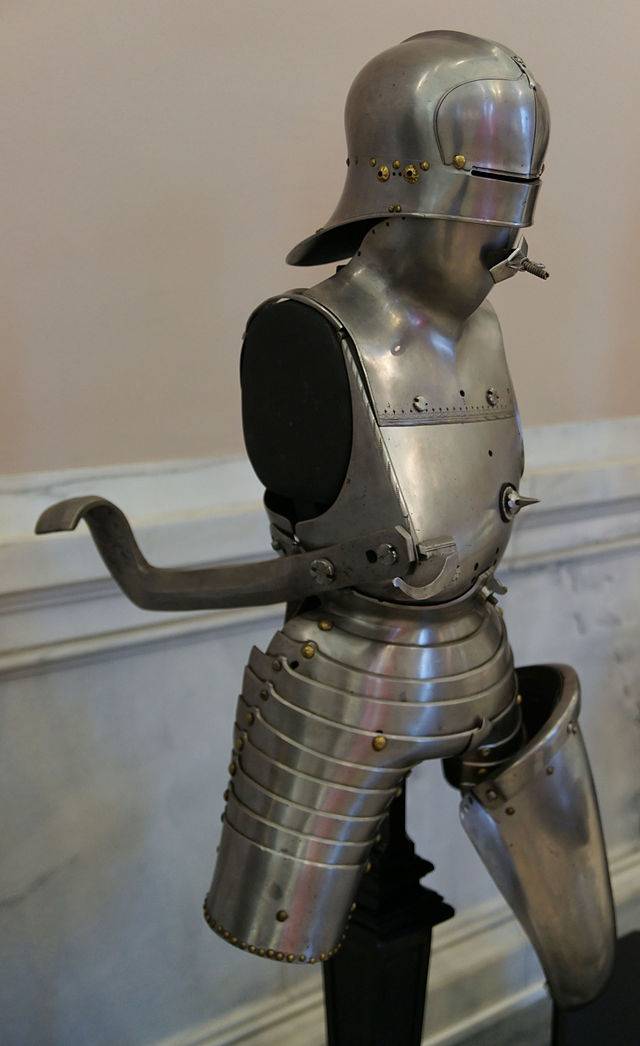 Турнирный доспех 1468-1532 гг. Чтобы облегчить удержание огромного турнирного копья в руках, турнирные доспехи снабжали специальными крюками – одним спереди, а другим – для упора – сзади. Последний помогал удерживать копье на линии удара и не позволял ему опускаться (Художественно-исторический музей, Вена)