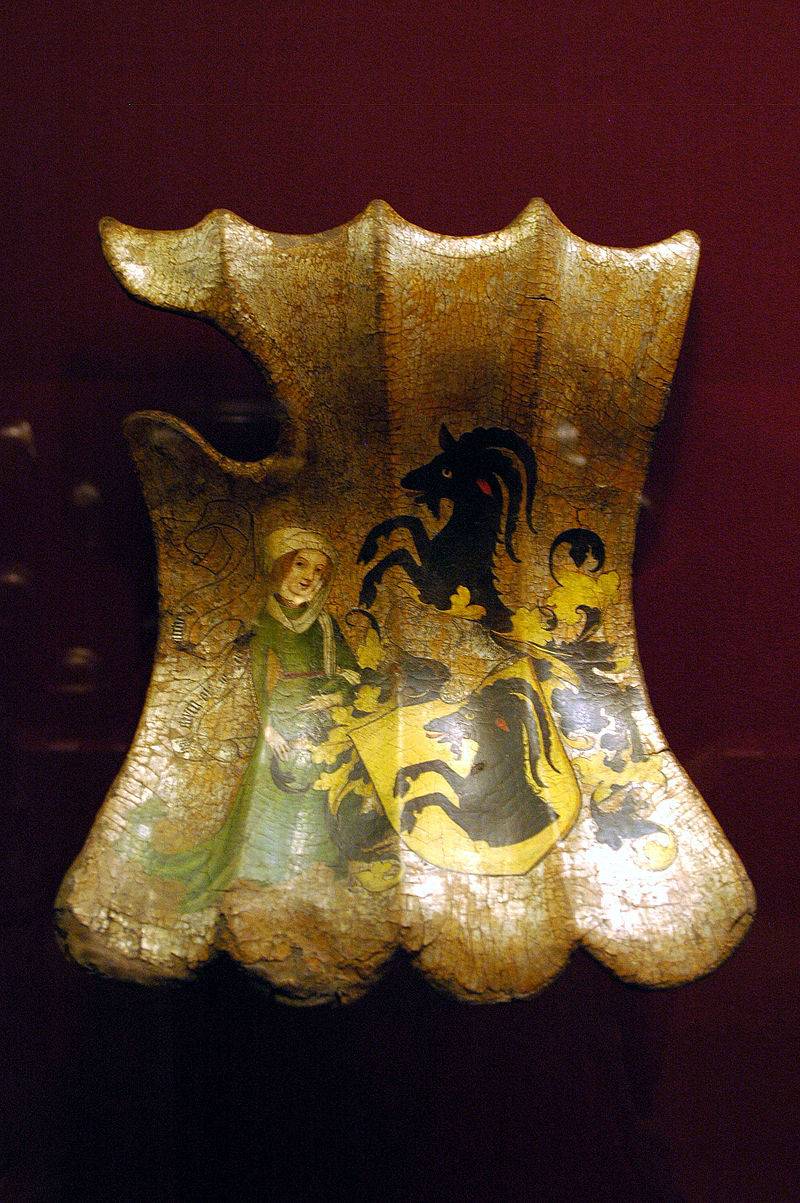 Немецкий тарч 1450 – 1500 гг. Вес 2,737 кг. Последние образцы щитов – тарчи, использовались уже не в бою, а на турнирах, ну и, разумеется, они очень ярко раскрашивались. (Метрополитен музей, Нью-Йорк)
