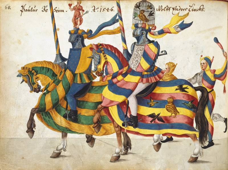 Миниатюра из «Альбома турниров и парадов в Нюрнберге». Конец XVI – начала XVII в. (Метрополитен музей, Нью-Йорк). Рыцари в турнирных доспехах и с самыми причудливыми нашлемными украшениями на голове. Поскольку турнир в данном случае проводился с барьером, доспехи для ног отсутствуют.