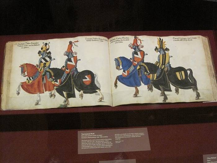 Внутри они нередко были полыми или древки надпиливали, чтобы они ломались от средней силы удара по щиту. Наконечник в виде зубчатой короны не мог соскользнуть с деревянного щита, но так как само копье при этом ломалось, удар для рыцаря не был фатальным. Поскольку, по указанным выше причинам, копья были фактически одноразовыми, рыцари брали на турнир сразу по несколько таких копий – иногда до десятка и более. (Метрополитен музей)
