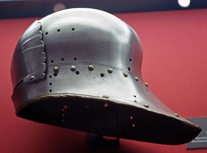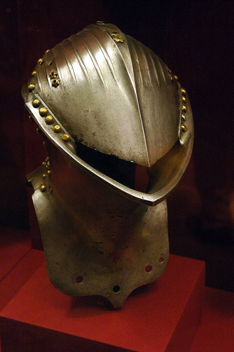 Турнирный шлем штеххельм или «жабья голова» 1500 г. Нюрнберг. Вес 8,09 кг. Намертво прикреплялся к кирасе. Достаточно было в момент столкновения с противником просто поднять голову, чтобы обеспечить себе стопроцентную защиту лица. (Метрополитен музей, Нью-Йорк)