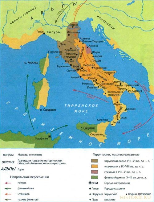 Однако этрусское влияние не было единственным и самым ранним. Установлены довольно тесные связи Италии с Грецией начиная уже с микенской эпохи, когда ахейцы основывали свои колонии на Апеннинском п-ове, связи, укрепившиеся в VIII в. до н. э. В VIII— VI вв. до н. э. города юга Италии и частично Лация уже связаны с многими центрами Греции, Сирии. В 508 г. до н. э. Римом был заключен договор с Карфагеном, имевшим свою факторию в г. Пирги (здесь была найдена посвятительная надпись богине Астарте на пунийском и этрусском языках). По преданию, когда римляне в середине V в. до н. э. впервые зафиксировали свое право (так назы ваемое право XII таблиц), они посылали в Грецию комиссию для ознакомления с тамошними законами. В 433 г. до н. э. в связи с эпидемией чумы они отправили запрос к дельфийскому оракулу и по его совету учредили у себя культ Аполлона-целителя. Очень рано ими стали перениматься некоторые греческие религиозные обычаи и ритуалы. Не следует недооценивать роль общеиталийского культурного фонда, который сложился еще до появления в Италии этрусков. К такому фонду можно отнести, например, предания об основании городов.