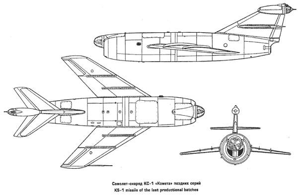 Работа авиационного КБ над проектом крылатого снаряда диктовала и метод решения задачи: за основу КС-1 взяли сначала компоновочную схему истребителя первого советского турбореактивного истребителя МиГ-9, а затем — более нового МиГ-15. В итоге именно облик этого истребителя и получила ракета КС-1, которая была, по сути, уменьшенной копией «пятнадцатого», но с крылом меньшей площади и большей стреловидности, поскольку маневрировать «Комете» не было нужды. Тем не менее, когда встал вопрос об отработке систем управления новым оружием, пришлось все-таки оснастить крылатый снаряд закрылками, а также добавить кабину пилота на месте отсека для боевой части, механизмы управления полетом и шасси. Так появились самолеты-аналоги К, или К-1, на которые и легла тяжесть первых этапов испытаний. Примечательно, что впервые К-1, по сути — пилотируемую крылатую ракету КС-1, в воздух поднял знаменитый летчик-фронтовик, дважды Герой Советского Союза Ахмет-Хан Султан, и случилось это 4 января 1951 года.