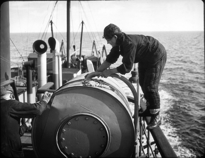 Матросы, работающие на судне во время экспедиции на Баренцево море. СССР, 1937 год.