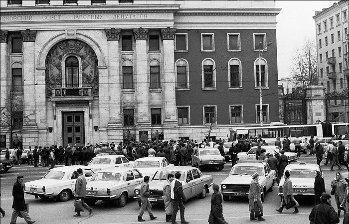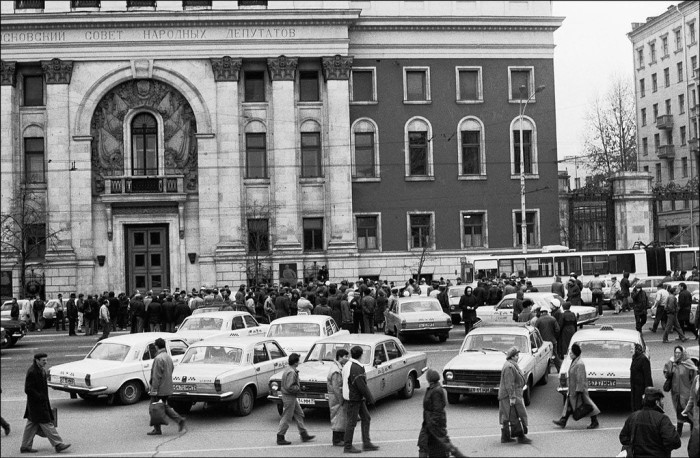 Таксисты перекрыли Тверскую улицу, требуя приватизировать таксопарк в 1991 году.