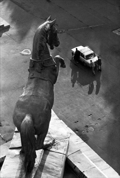 Скульптура коня на крыше Центрального московского ипподрома в 1990 году.