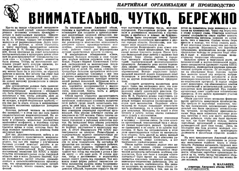 Для нас, дальневосточников, забота о создании здорового нравственного микроклимата в каждом коллективе — дело первоочередное, так как это наряду с улучшением бытовых условий помогает растить и закреплять постоянные кадры рабочих, специалистов. руководителей. Ведь благодаря постоянному вниманию ЦК КПСС и правительства производительные силы Амурской области, как и всего Дальнего Востока, бурно развиваются, растут объемы промышленного и сельскохозяйственного производства, что предопределяет большую потребность в кадрах, можно сказать, всех профессий.