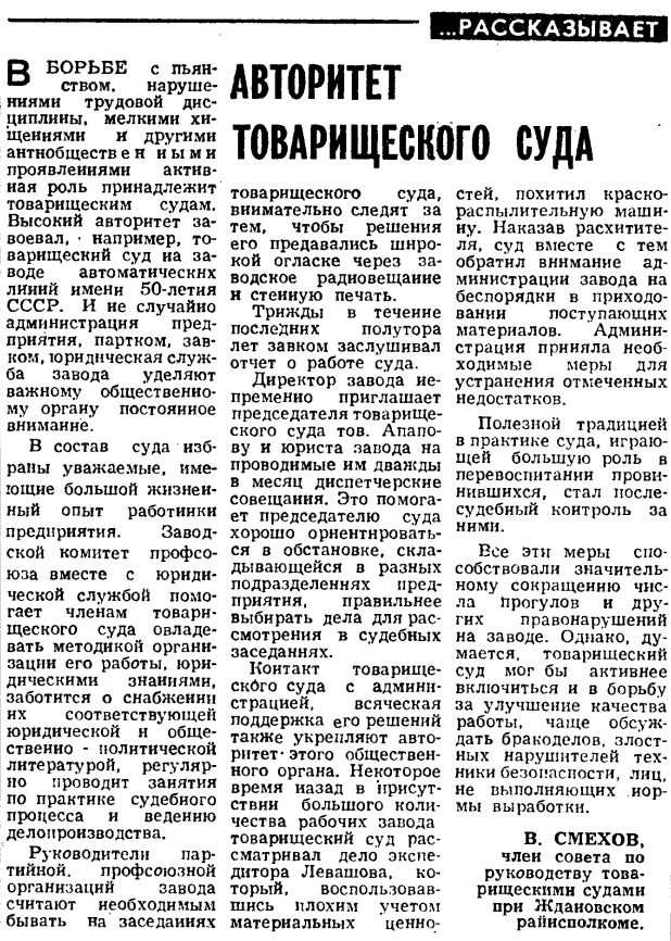 Заметка из газеты “Вечерняя Москва” от 18 июля 1975 г. “Авторитет товарищеского суда”