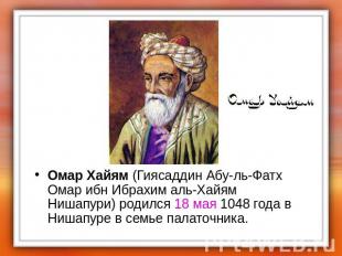 Гияс ад-дин Абуль Фатх ибн Ибрахим Омар Хайям Нишапури родился 18 мая 1048 года в Нишапуре. Нишапур, расположенный на востоке Ирана, в древней культурной провинции Хорасан, был ярмарочным городом для многих, даже отдаленных, провинций Ирана и Средней Азии и для ближайших стран. Нишапур был одним из главнейших культурных центров Ирана; с XI века в городе действовали школы среднего и высшего типа – медресе.
