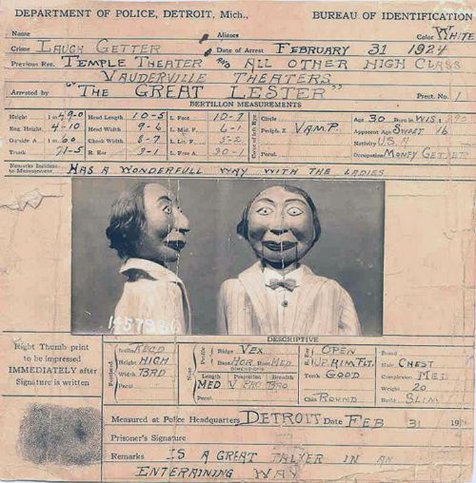 В другой раз куклу Лестера в 1924 году обвинили в убийстве. Во время представления три старушки умерли от смеха. Когда приехала полиция, то очевидцы утверждали, что это говорила кукла, а губы Великого Лестера не шевелились. Вину артиста не доказали, а вот его «напарнику» досталось больше. Куклу Фрэнка забрали в участок, завели дело, сфотографировали и… навсегда запретили выступать на сцене.