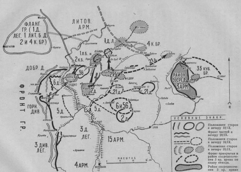 Расчет польского командования на быстрое овладение р. Неман не увенчался успехом. Убедившись в стойкости советских частей на подступах к Гродно, польское командование 24 сентября отдает приказ о приостановке наступления своей фланговой группы. Для оказания содействия группе выделяются пехотная и кавалерийская бригады с задачей наступать в южном направлении.