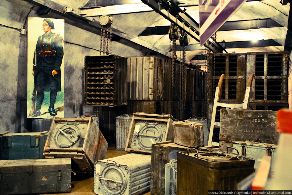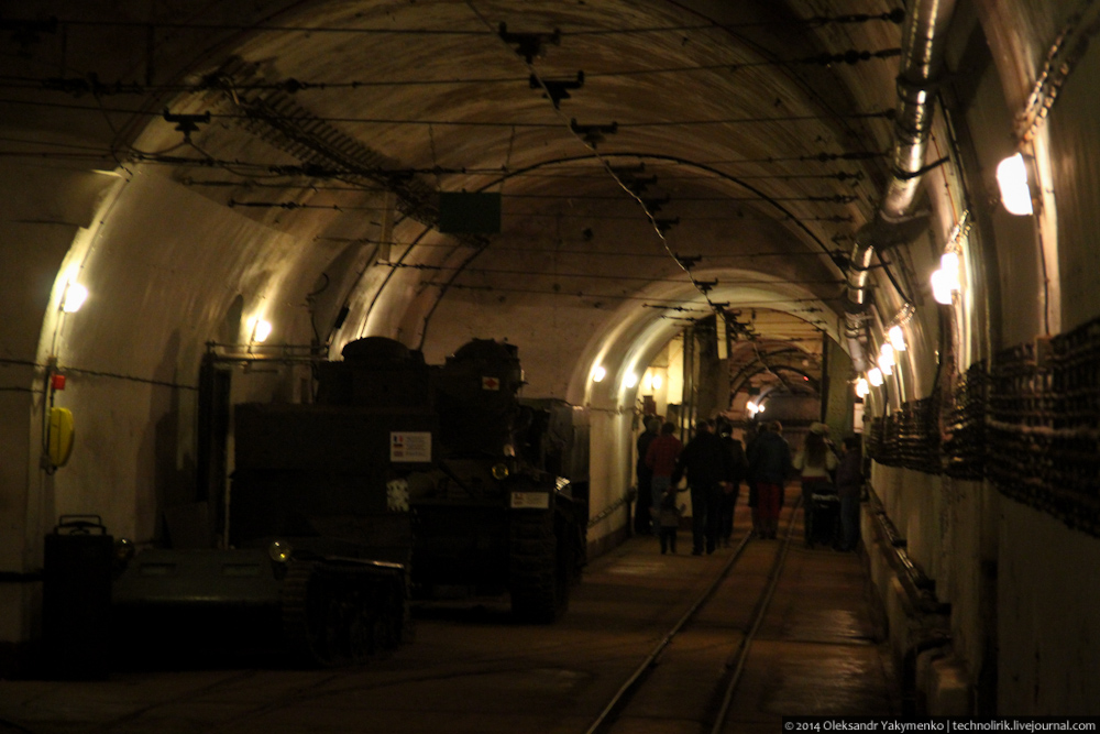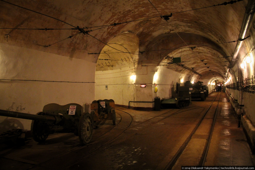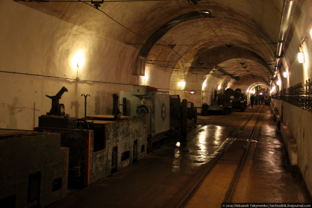 11. Преодолев около двухсот метров вдоль основной потерны, мы попадаем в огромный подземный вокзал. Тут происходила перегрузка грузов и боеприпасов с железнодорожного состава, пришедшего с поверхности, на вагонетки внутренней железной дороги. На этом фото виден узкоколейный вагон внешней железной дороги, на таких вагонах сюда доставляли военные грузы.