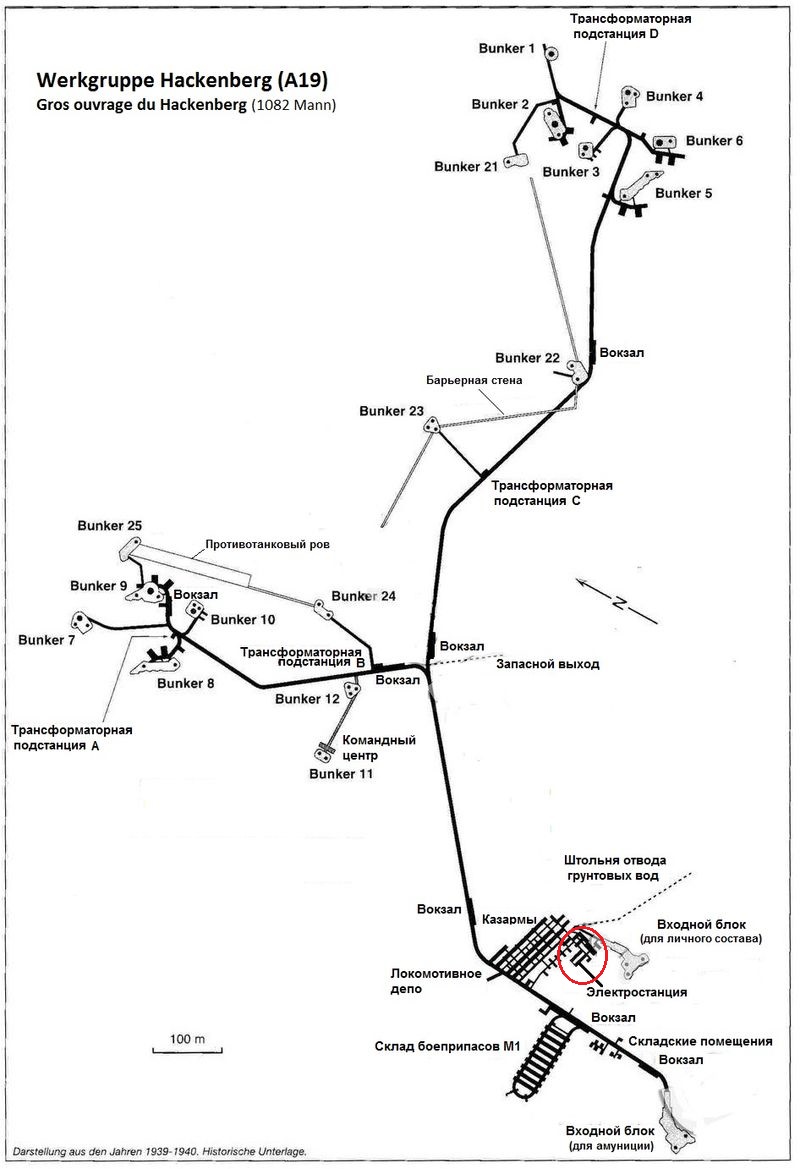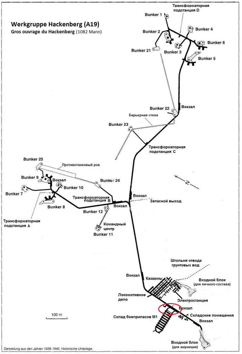 Чтобы лучше понимать масштабы объекта, приведу детальную карту этого сооружения. Красным овалом я обозначил место возле склада М1, где мы сейчас находимся. На карте видно, что объект состоит из трех условных секторов: сектора обеспечения и двух групп бункеров западной (в центре карты) и восточной (сверху). Особенностью этой крепости является наличие противотанкового рва и противотанковой подпорной стены откоса. Кроме этой крепости противотанковый ров был лишь у одного артиллерийского форта линии Мажино – Ouvrage Hochwald. Сооружение насчитывает 17 боевых блоков, и является самым крупным сооружением линии Мажино.